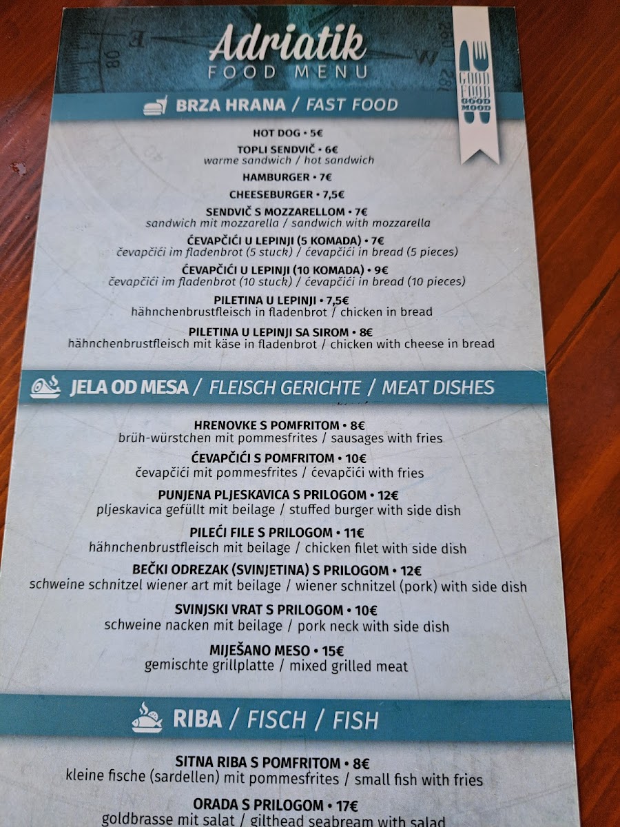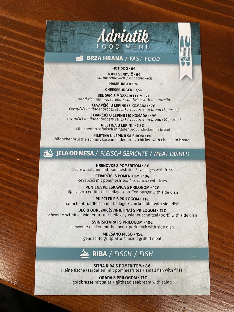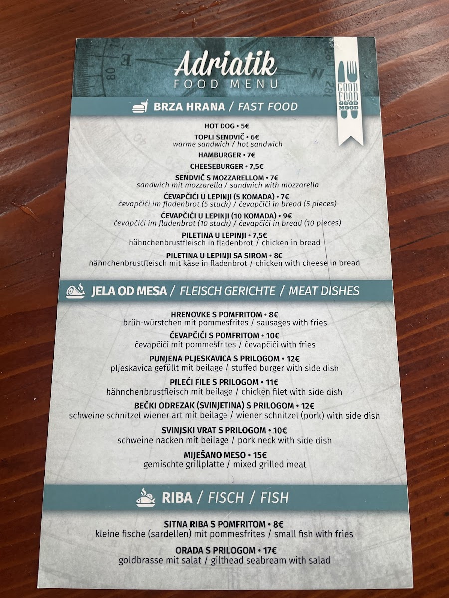 Ćevapi in flatbread with ajvar and onions offer an unbeatable beachfront value, pleasing every palate.